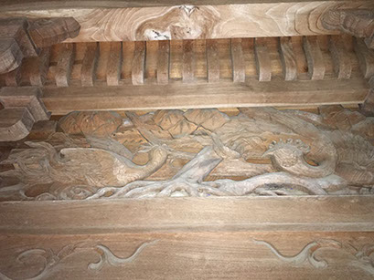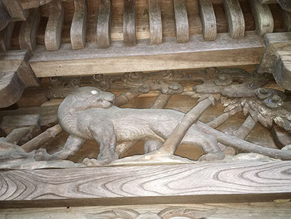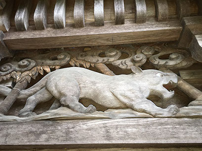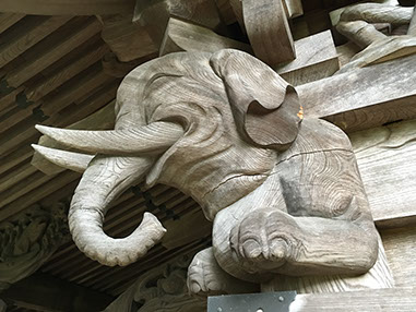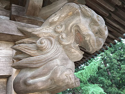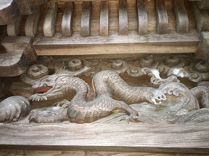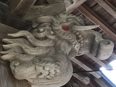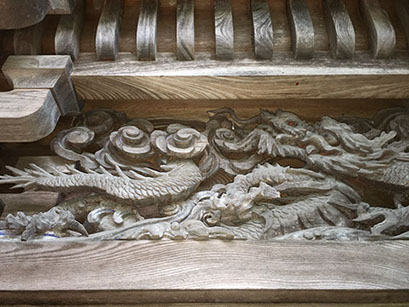 御祭神はまた、火伏の神とも称せられ鎮火・防火の神でもあります。鎮火祭(ひしずめのまつり)は正にこの御祭神のお祭りです。神社本殿の正面に見事な龍の彫り物があります。また、拝殿に納められてある龍の飾り大額や、二の鳥居に刻まれてある龍はいずれも龍の吹き出す水によって火を消す、火伏の神の化身であると考えられます。