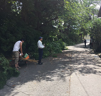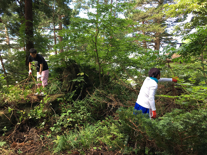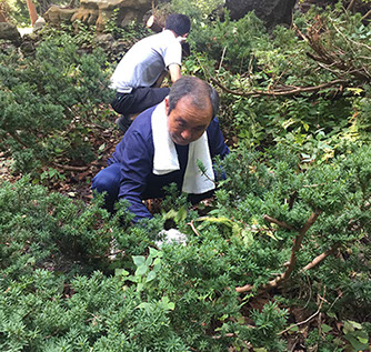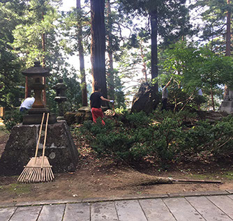 今年は、境内と池周りの雑草取りから始まり、参道を中心に雑木の伐採や剪定をした結果、長年放置されていたせいもあり、ものすごい量の雑木の山が処理されました。清掃後には参道に日の光がたくさん入るようになり奉仕をした充実感に満たされました。皆様大変ご苦労さまでした。