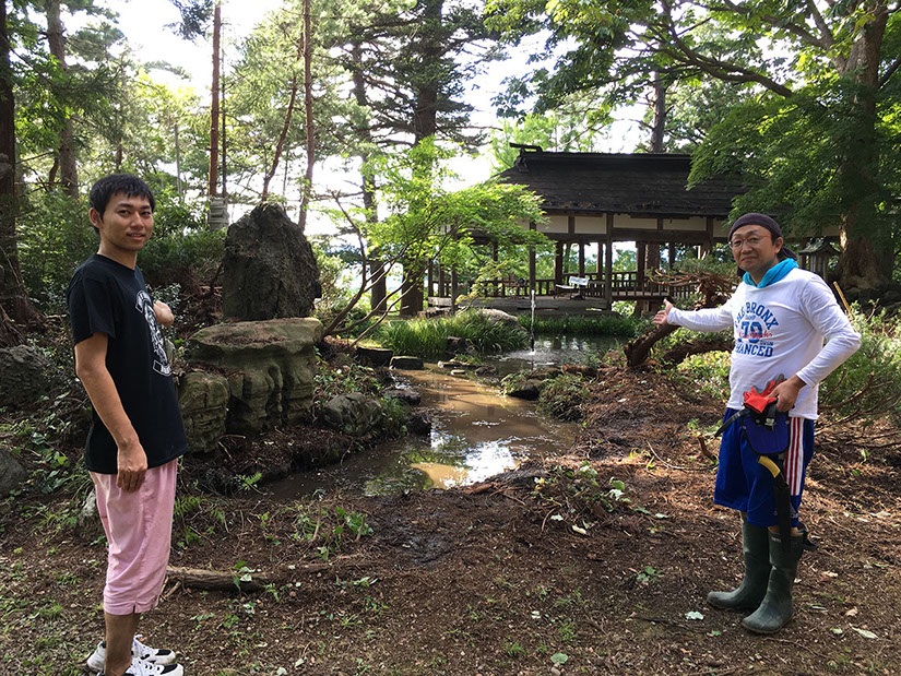平成28年8月28日と9月4日に大町若者の皆様により、境内の池の周辺を清掃奉仕して頂きました。うっそうと生い茂った木の枝や雑草で池の半分が覆われていたのが、ご覧のように見違えるようにすっきり致しました。ありがとうございました。